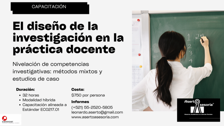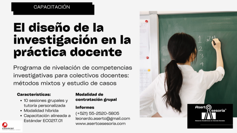 La docencia sin investigación es poco profunda; la investigación sin la práctica es poco útil. Los colectivos docentes requieren dominar ambas. El objetivo de esta capacitación es brindar fundamentos sólidos en el diseño de la investigación con énfasis en métodos mixtos y estudios de caso. La capacitación que ofrecemos se basa en el Estándar EC0217.01 de CONOCER y brinda un asesoramiento continuo, alineado a tus objetivos institucionales.